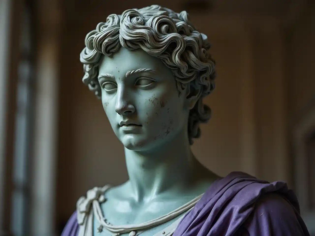Green marble sculpture Venus head and shoulders serene face.hellenistic 1st century AD,soft lighting of a handsome young European wearing a purple royal regalia in his Palace