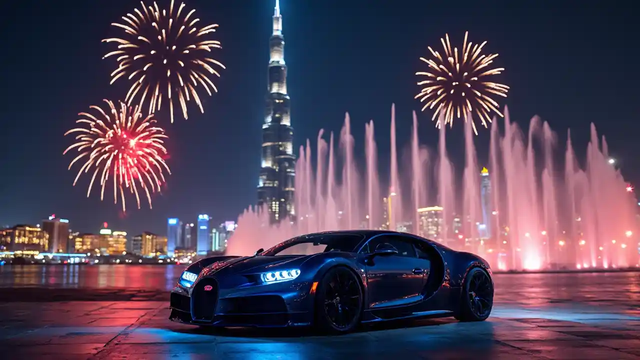 A Bugatti Veyron infront of Burj Khalifa at night with neon lights and fountain at background full lightings and crackers busting in slt with lights all around