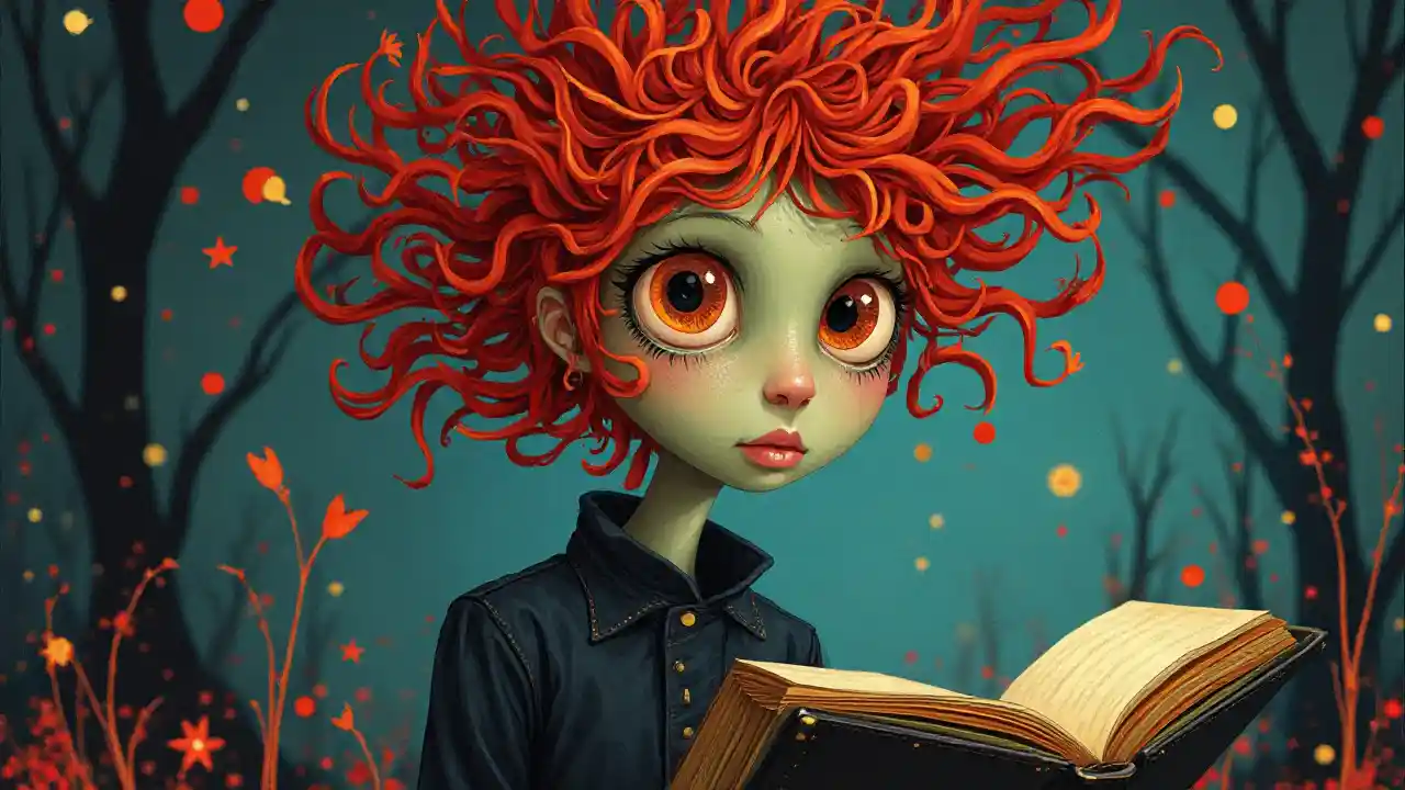 Reading a book by Andy Kehoe and Tim Burton. Big sad eyes, a tangled red-head wearing gothic-punk clothes. Vibrant modern fairytale scene of spiraling esthetic beauty, abstract art, complementary colors, fine details. sharp, focused, vibrant, colorful, clear image