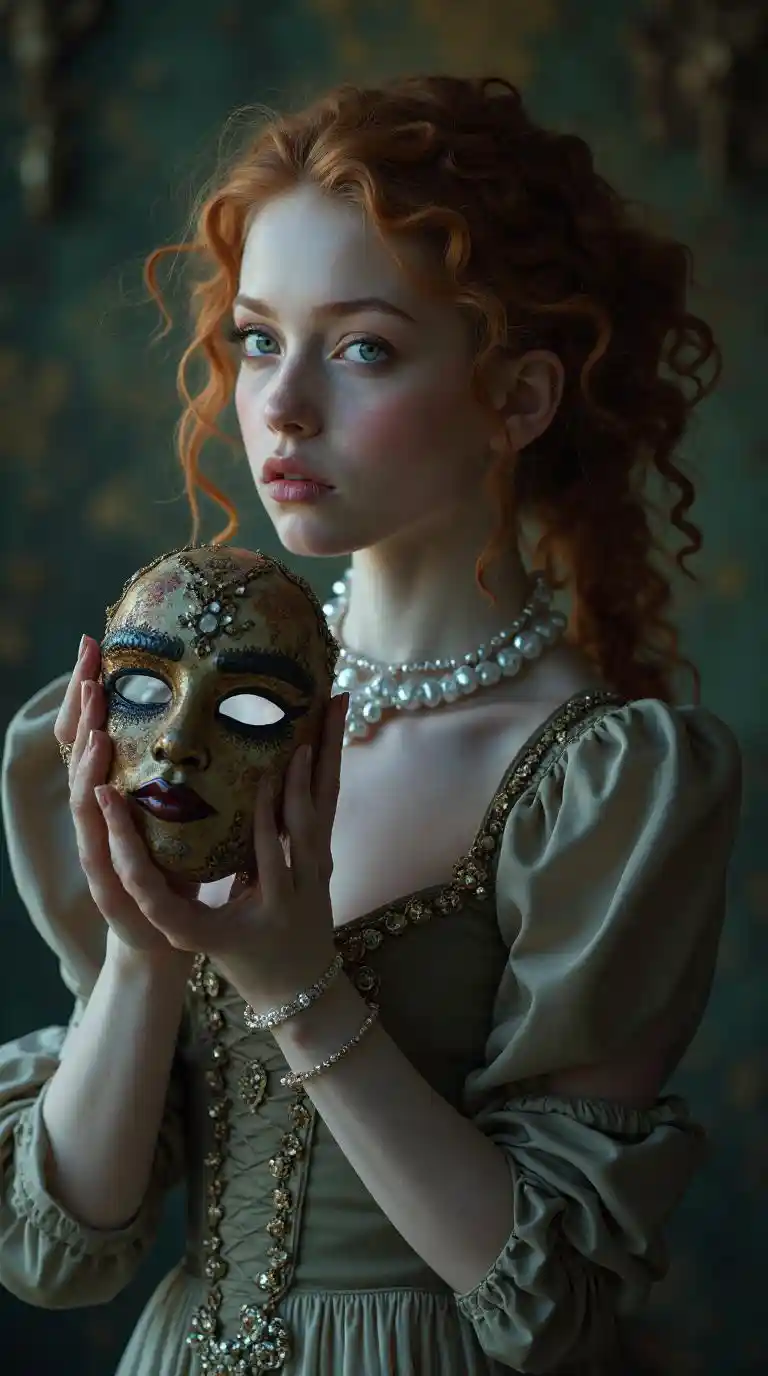ScarlettA girl top model holding a mask made of crystals on in his hand, cinematic , dramatic, victorian dress, winded hair and dress