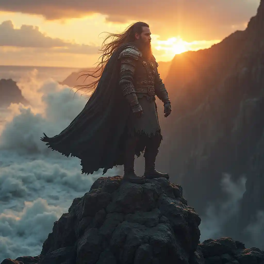 Majestic Viking Stands on Rugged Cliff Amidst Dramatic Sunset
