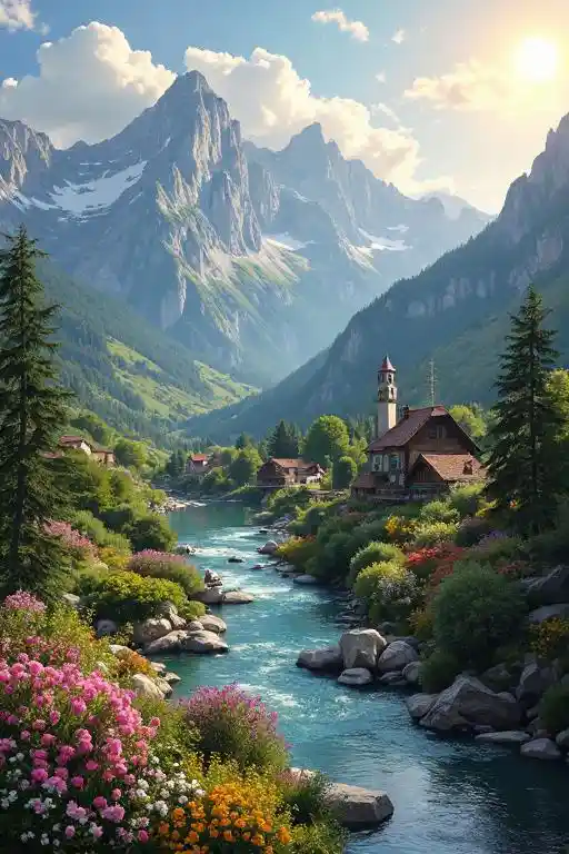 A small village by the river, mountains in the background, colorful flowers, detailed landscape, beautiful natural scenery, atmospheric lighting, scorching sun