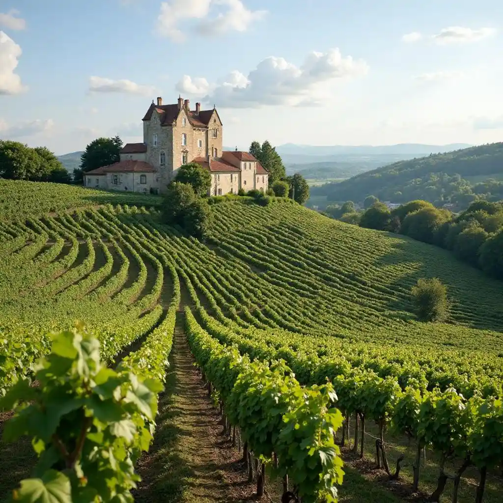 A sprawling vineyard, with a rustic chateau overlooking the grape-laden vines.