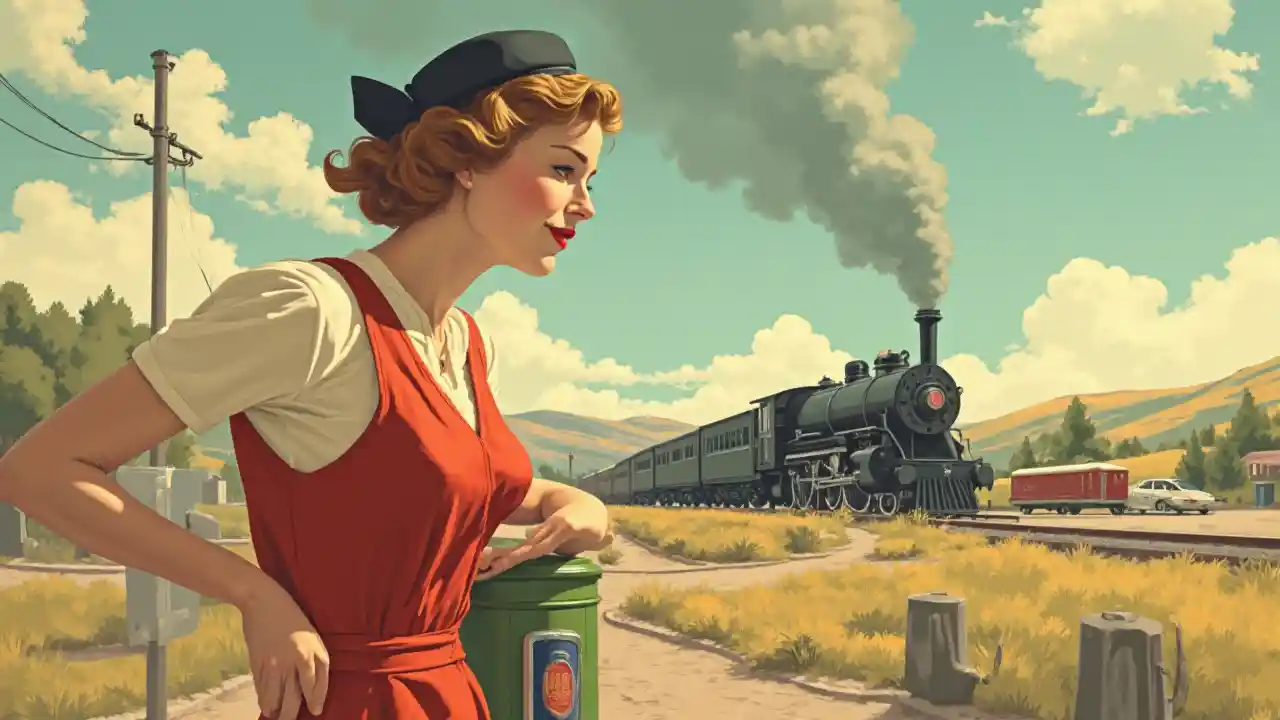 Benjamin1940s beautiful woman, embrassing petrol pump, at a petrol station, by edward hopper, de chirico, flat paint, art deco style, 1940, steam train in landscape, highly detailed, minimalist, sharp focus