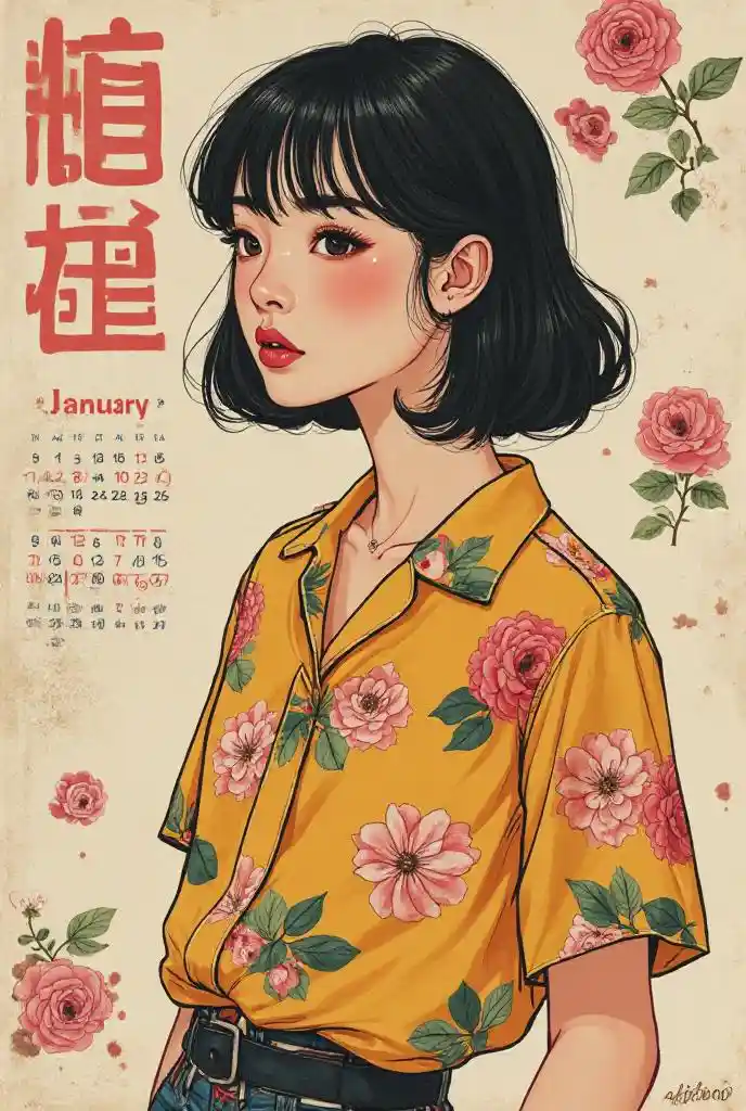 AlexanderA collage-style calendar featuring an Asian woman wearing a retro shirt. (Retro feel: 12), divided into 12 panels behind the woman. January: Rose flower, Februa
