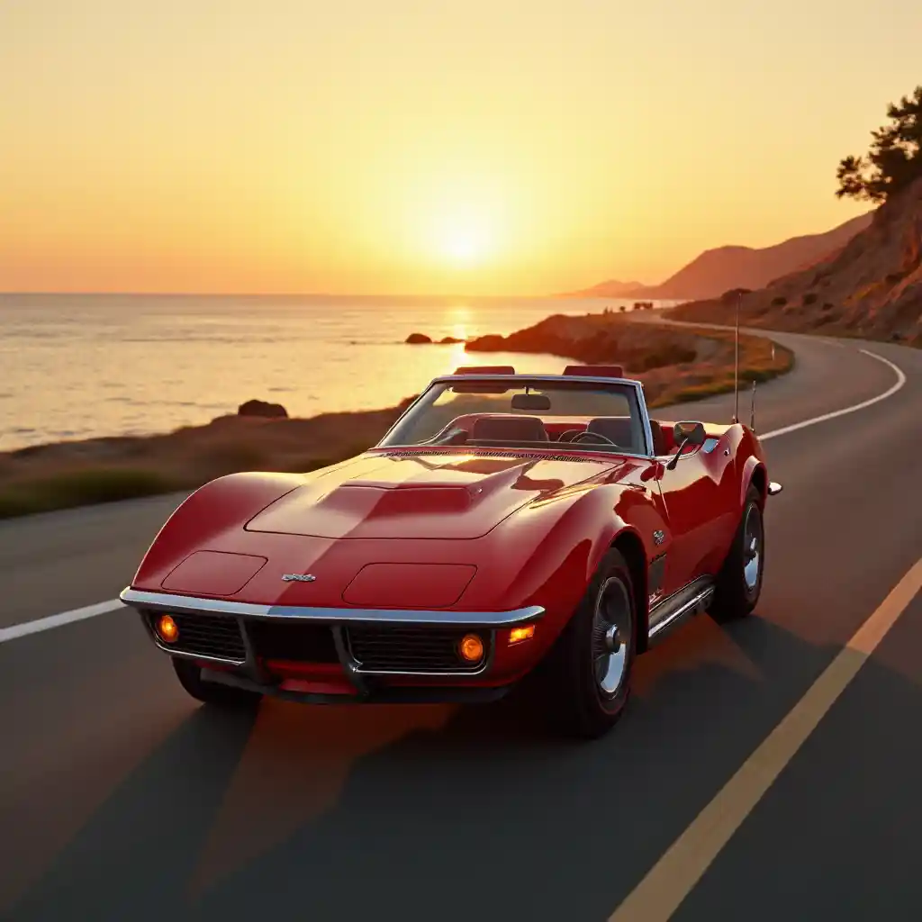 1969 red corvette stingray convertible speeding through Malibu in the sunset