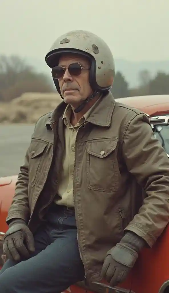 EllaSepia 1960Photographs of the ages 。A man wearing a helmet wears driver's gloves next to a Toyota2000GT。 men30At age 、 wearing sunglasses 。leather jacket。