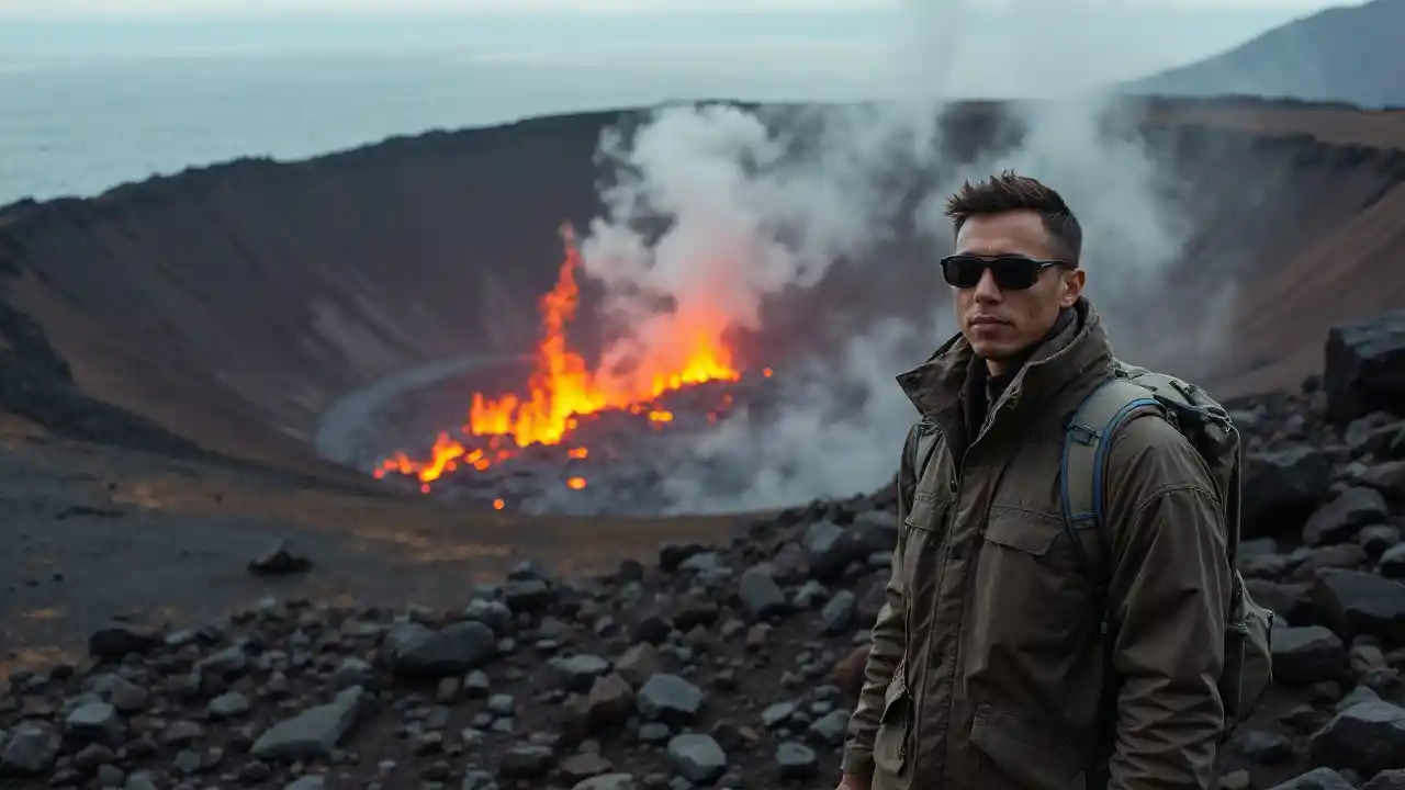 SawyerHiking a volcanic crater, an Asian man in his 20s glows in a rugged jacket. Lava fields and steam vents frame him, his adventurous spirit and athletic build exuding bold, elemental charisma.