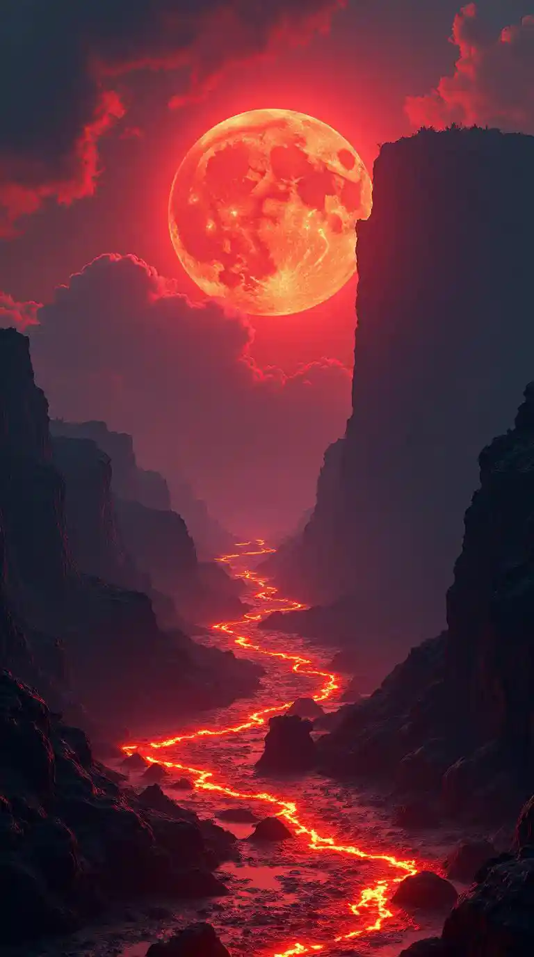 a volcanic eruption, a river of fiery red lava, a waterfall, a large red moon in the background, dramatic lighting, cinematic composition, photorealistic, (best quality,4k,8k,highres,masterpiece:1.2),ultra-detailed,(realistic,photorealistic,photo-realistic:1.37),dramatic lighting,dramatic sky,dynamic composition,volumetric lighting,intricate details,vivid colors,3d render,concept art