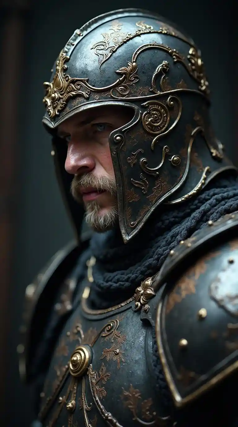 A headshot of a warrior adorned in intricate fantasy armor, featuring metal detailing and rich decorations. The atmosphere is dark and cinematic, with medieval aesthetics that emphasize the rugged and heroic nature of the character. Emphasizing dramatic lighting for a photo-realistic effect, highlighting the contours and textures of the armor.