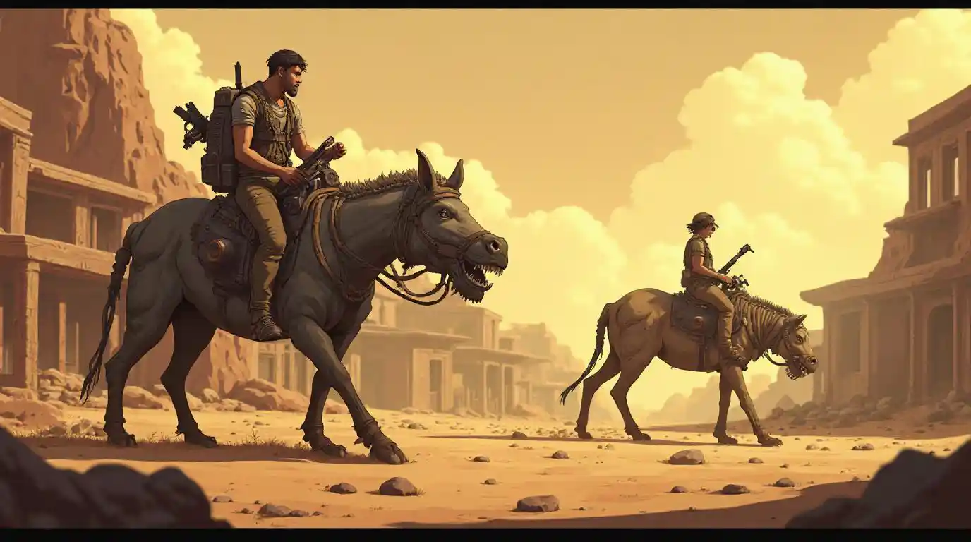 AvaPost-apocalyptic desert town, traders on mechanical beasts, in a gritty, survival anime style.