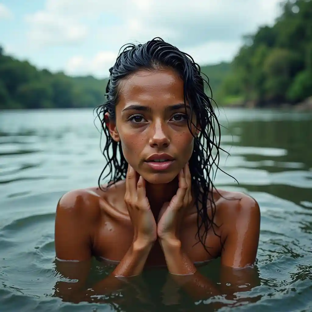 A young Amazonian woman with her face emerging from a body of water, possibly a river. Her mouth is open and is partially submerged breathing water, with water droplets clinging to her skin. She has a serene expression, with her eyes looking directly at the viewer. Her wet hair is slicked back, and she gently places her hands on her neck. The backdrop features agitated water body with a forested shoreline. The sky above is partly cloudy, suggesting a late afternoon or early evening setting. Wild-Life set