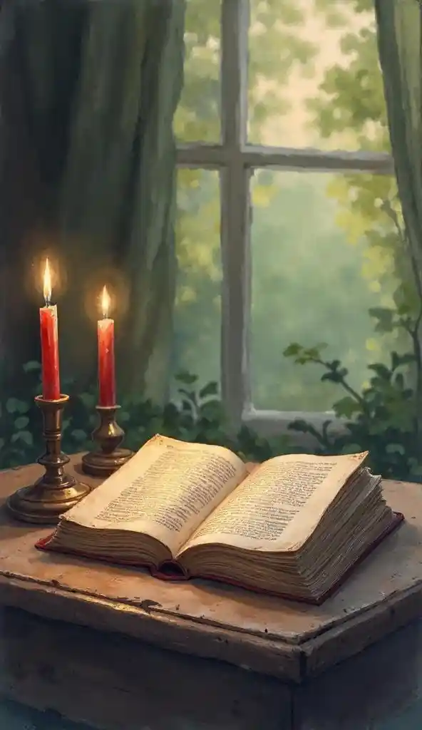 MichaelAn old book on a table in the light of a candle. watercolor blurred background. In the style of a picture book. In the style of watercolors that are highly dilu