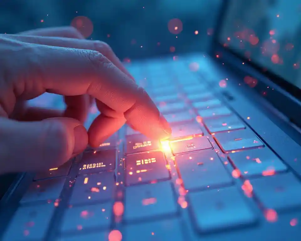 JulianA dreamlike, watercolor-style illustration of a human finger pressing the "Enter" key on a soft-glowing keyboard. As the key is pressed, delicate streams of col