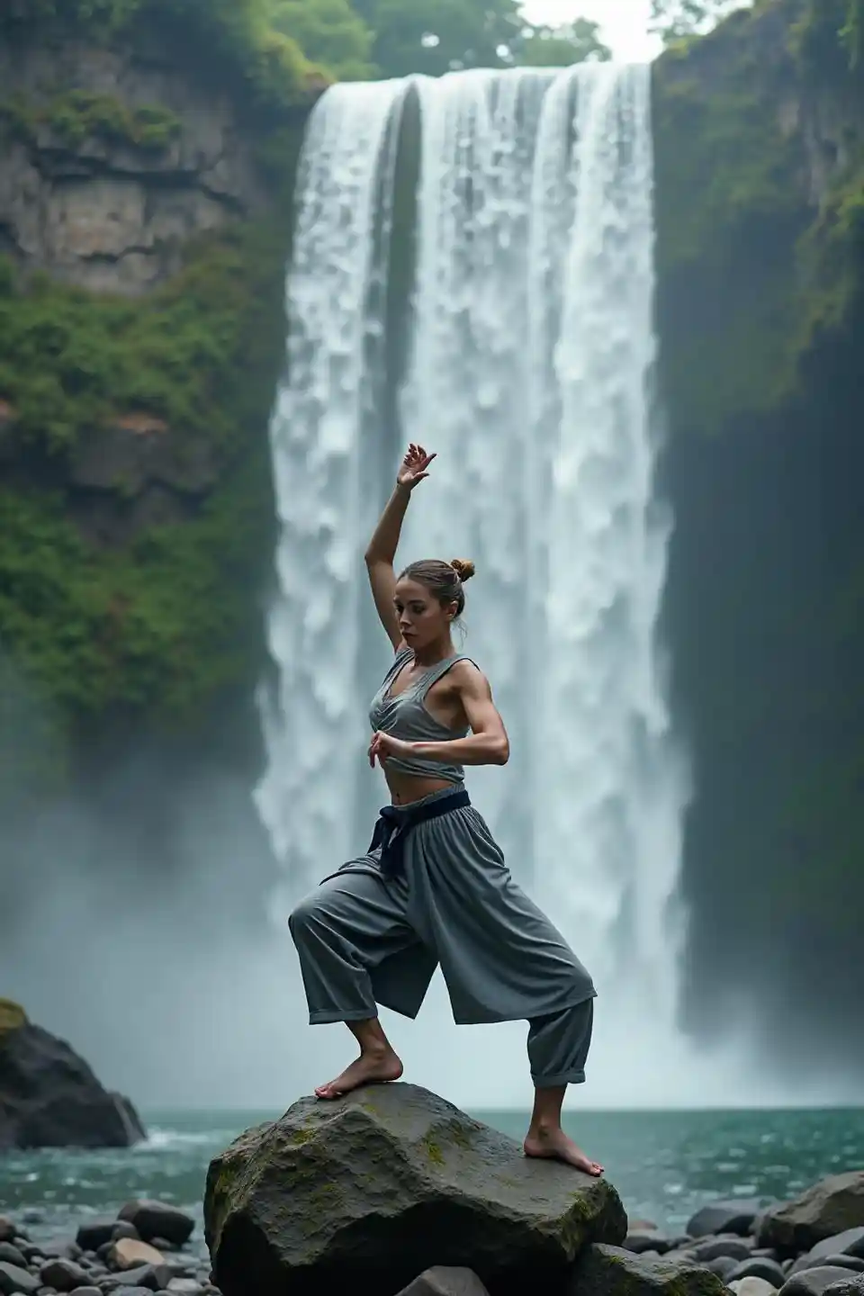 Lincolnhuge waterfall,Stepping Stone on a Waterfall,Woman implementing martial arts techniques,Detailed Expression and Posture,Textured Background,Faded Stone Materia