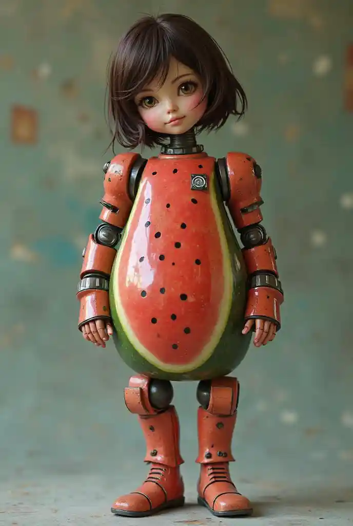 Scarlett((Watermelon design body))、Cyborg girl with a watermelon body、 70s Cyborg 、made by hand by skilled craftsmen、、Actual Product、詳細な肌、 dark brown berry short hair