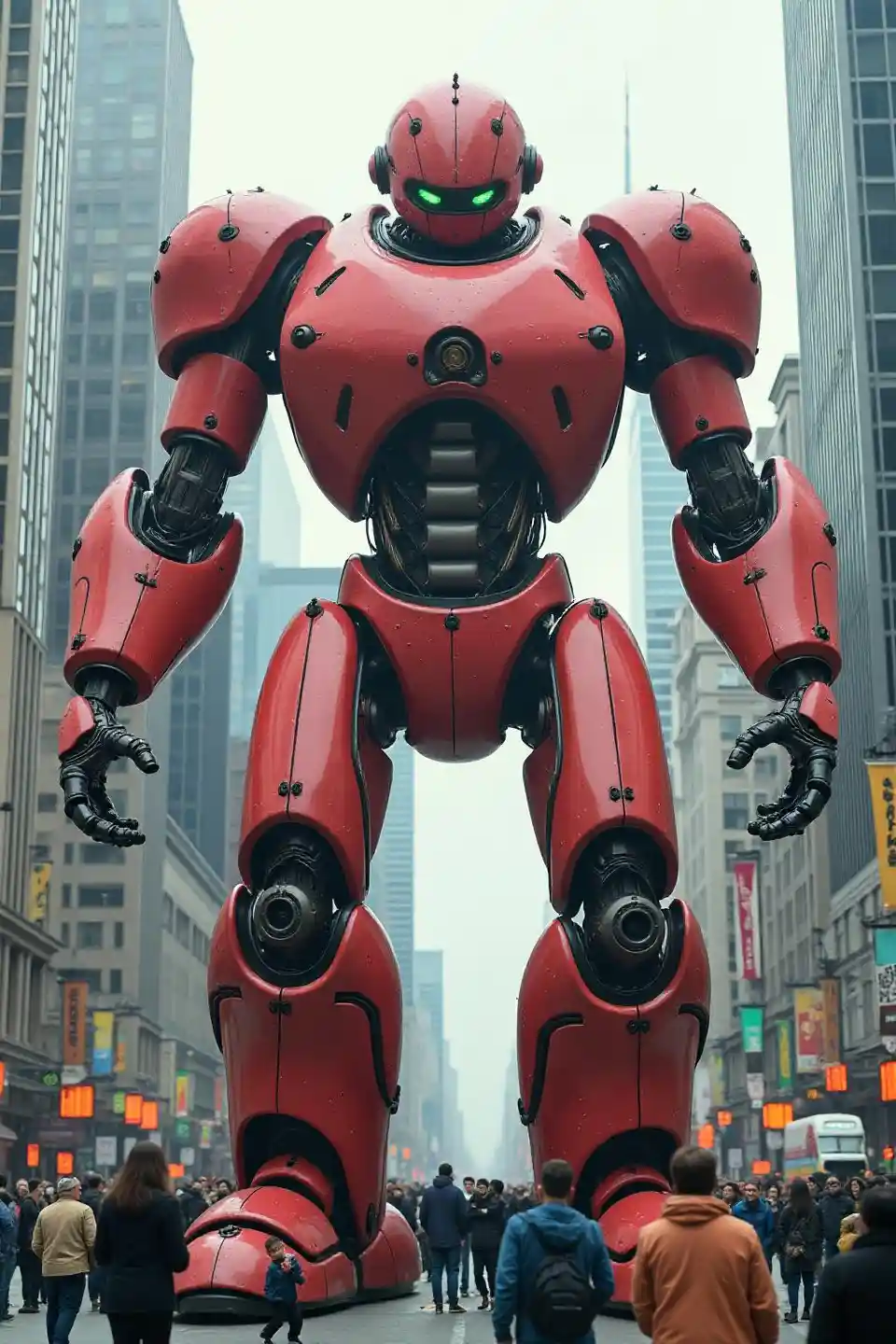 gigantic (watermelon) robot with gears, strong arms and legs, robotic face,in the city, cityscape background, (wide angle:1.5), a lot of people looking the robo