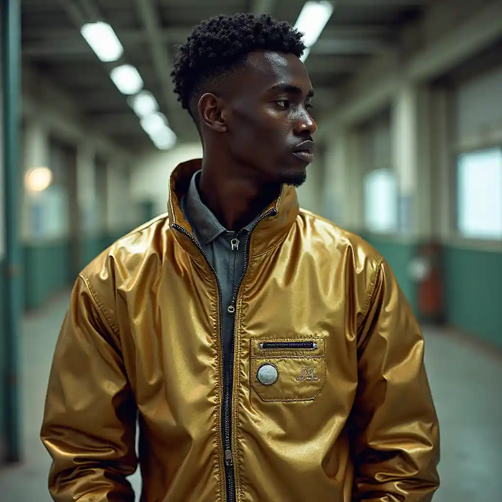 a Welder Jacket, futurist, mechanic, gold, silver, shot on leica, fashion portrait, by kith