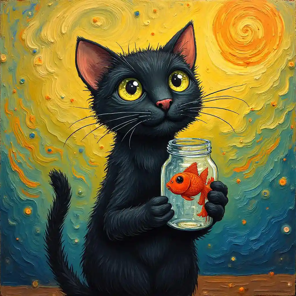 a curious black cat standing upright, with its large round eyes brimming with surprise. The cat is holding a clear glass jar containing a vibrant orange fish. The background is a swirling tapestry of warm yellows, deep blues, and rich greens, reminiscent of Van Gogh's "Starry Night." The artwork features thick, impasto paint application, creating texture and depth. The cat and fish are rendered with short, energetic brushstrokes, emphasizing their forms through color and movement rather than precise lines. The color palette is dominated by intense yellows, deep blues, vibrant oranges, and stark blacks, creating a sense of emotional intensity and dynamic energy. The overall composition embodies Van Gogh's signature style, blending reality with a dream-like quality, while maintaining the whimsical interaction between the cat and fish.