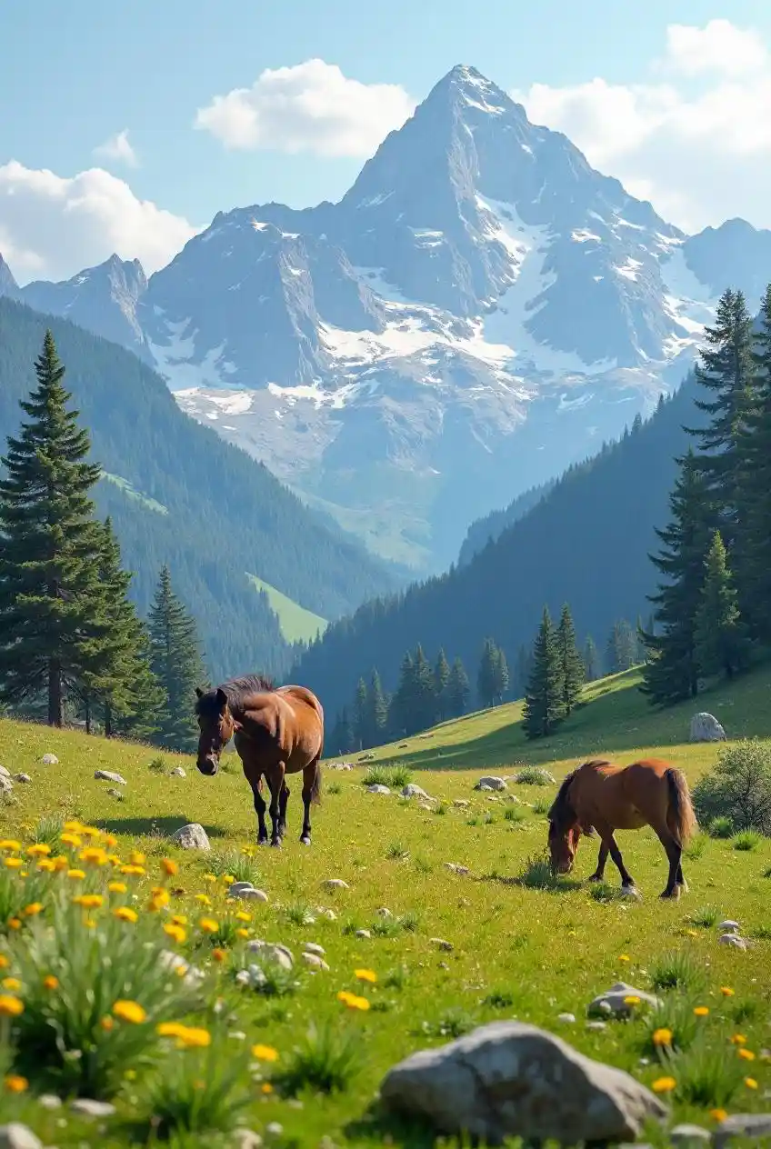 Grand alpine meadows, with wild horses grazing beneath snow-capped peaks.