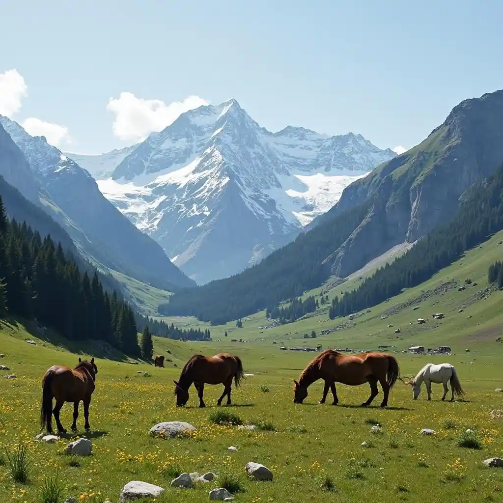 Grand alpine meadows, with wild horses grazing beneath snow-capped peaks.
