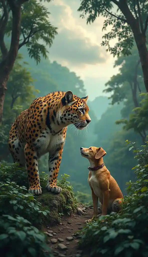 Madelynbig cat versus small dog, detailed background, forest, amazonia, trees, cloud, overcast