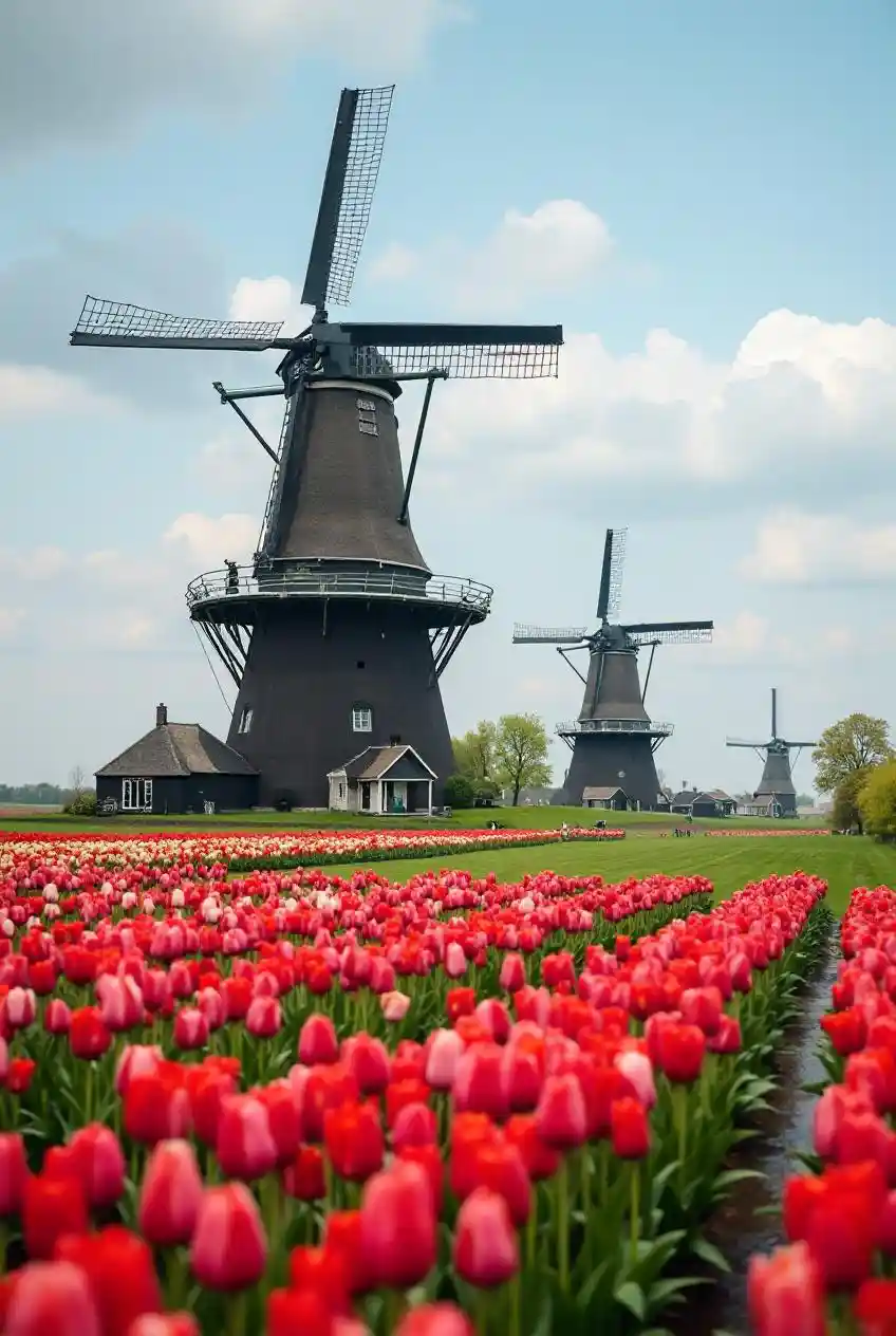HarperA Dutch town with windmills turning slowly beside tulip fields.