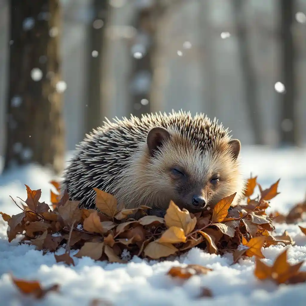 MilaIn a winter forest, a hedgehog sleeps in a pile of leaves.