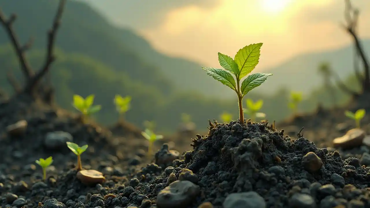wiry wood elemental, feeding new life into a scorched landscape, seedlings sprouting from ash, intricate textured bark skin, conveying rejuvenation amidst desolation, warm and hopeful color tones, soft sunlight breaking through gray clouds, magical green aura over the ground, atmosphere of renewal and resilience, ultra-detailed, dramatic depth, showcasing the stark contrast between the elements of destruction and rebirth.
