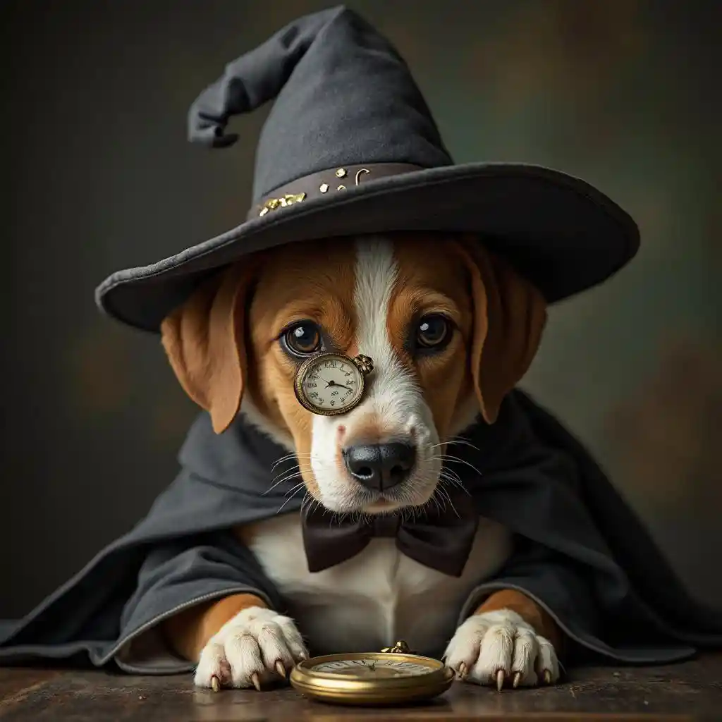 AuroraA dog wearing a witch's hat with a monocle, looking at a golden pocket watch