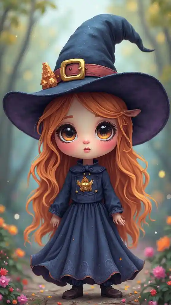 beautiful Witch、 Witch's hat、fantasy、watercolor、Fairy Tale Scenes、Candy House、big eyes、cute face、Professional, simple background、vivid colors, bokeh effect simi