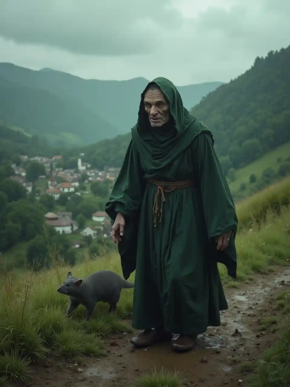 An old witch dressed in dark green, ugly with a big nose and warts, crooked back viewed from the front, one grey rat by her feet. Striding up a hill with a medieval village in the valley below. Overcast sky and rain falling.