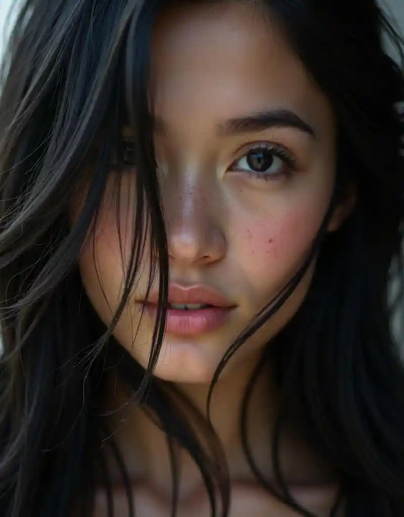 AidenA highly detailed and realistic extreme close-up that looks lifelike yet natural of a young woman with long flowing black hair gently covering part of her face.