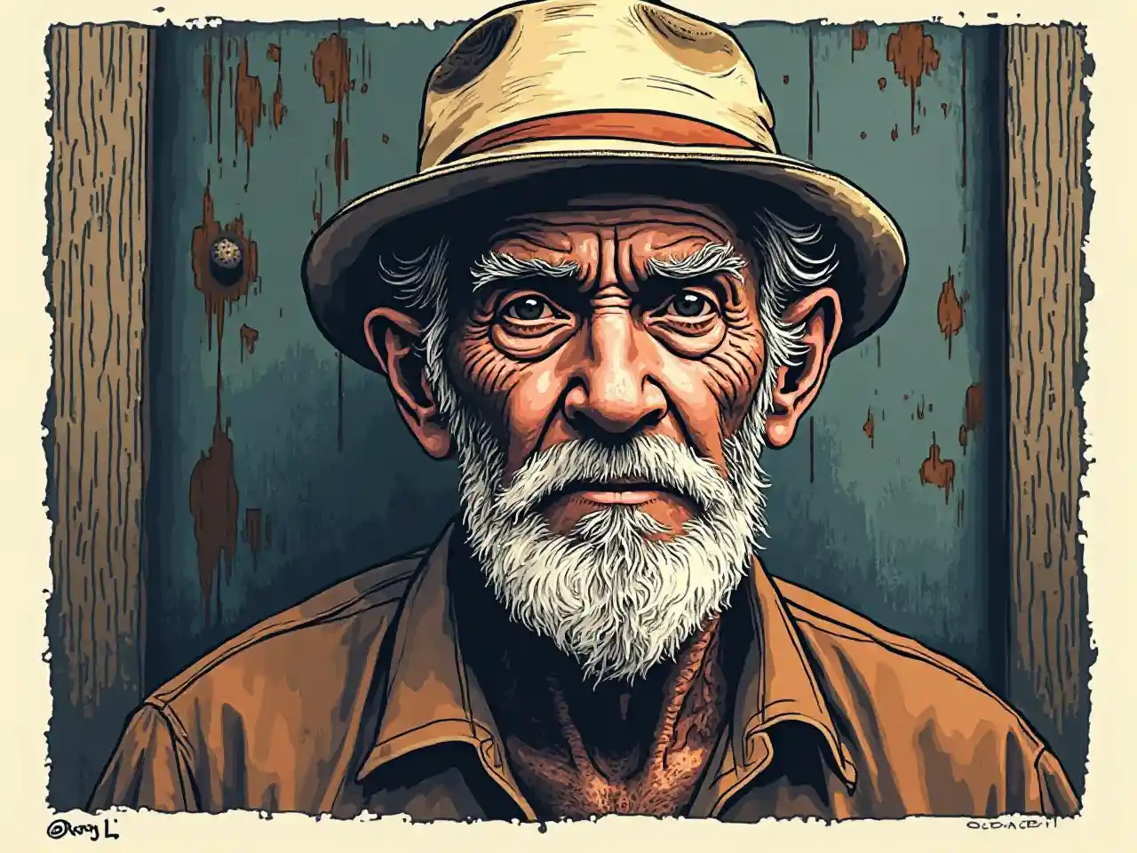 Woodcut print of an old man, digital art, vector, art by roy l davies and tugboat printshop
