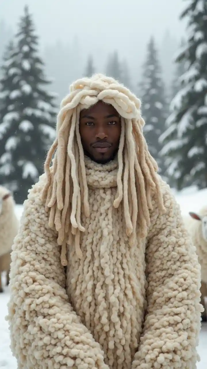 Portrait of black model, thick wild giant albino-beige wool dreadlocks. very large, thick beige woolly sheep’s clothes. surrounded by sheep and big wool trees. wool snow falling. everything is made out of sheep’s wool. model matches the sheep. snowy mountain top