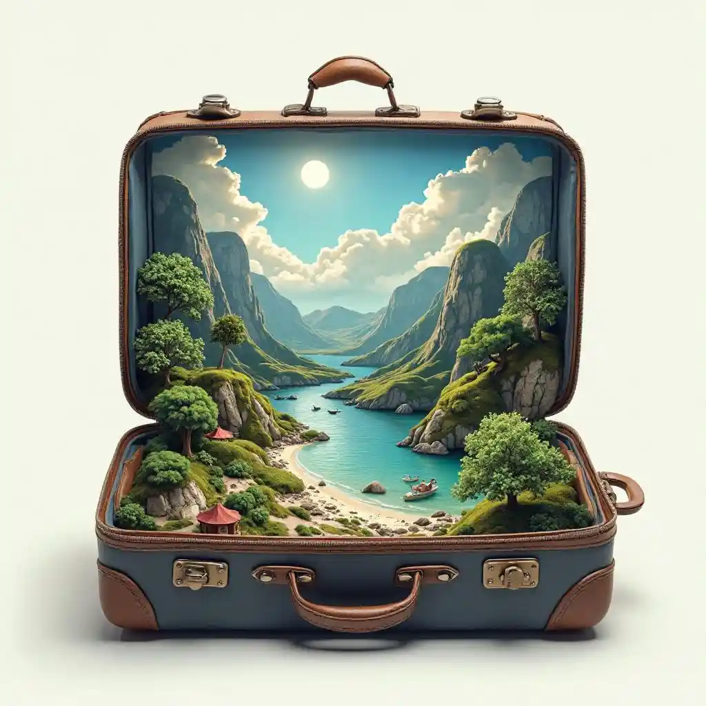 ElsaCreate a visual where an open suitcase contains not clothes, but various landscapes from around the world, suggesting that every journey brings new experiences.