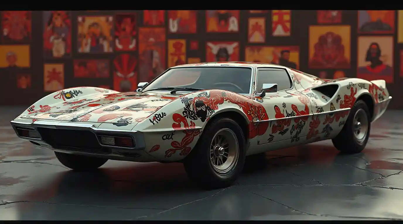sleek futuristic concept car from 1982. Japanese yakuza pattern as decoration, studio background.