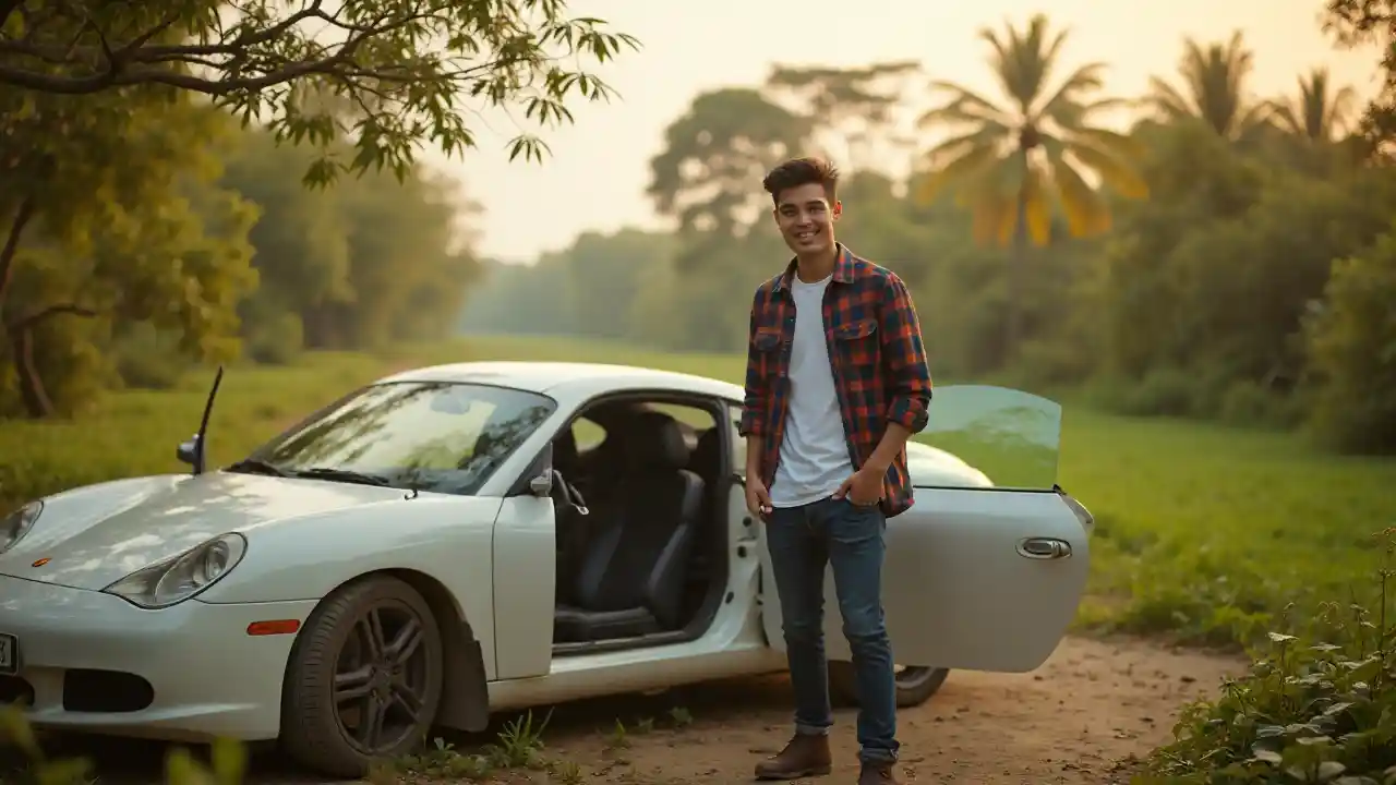 Amidst a rural setting, a young man stands confidently beside a sleek white car, its door ajar, inviting a sense of adventure. Dressed in a plaid shirt and casual trousers, he flashes a friendly smile that conveys happiness and pride, perhaps at being outdoors or sharing a moment with friends. The background features scattered foliage and a green field, suggesting a warm, late afternoon under soft, diffused light that hints at sunset. Delicate palm trees frame the scene, complementing the casual atmosphere, while the composition emphasizes the car as a symbol of freedom and exploration. This image captures a moment of youthful exuberance, evoking a narrative of journeys yet to come.