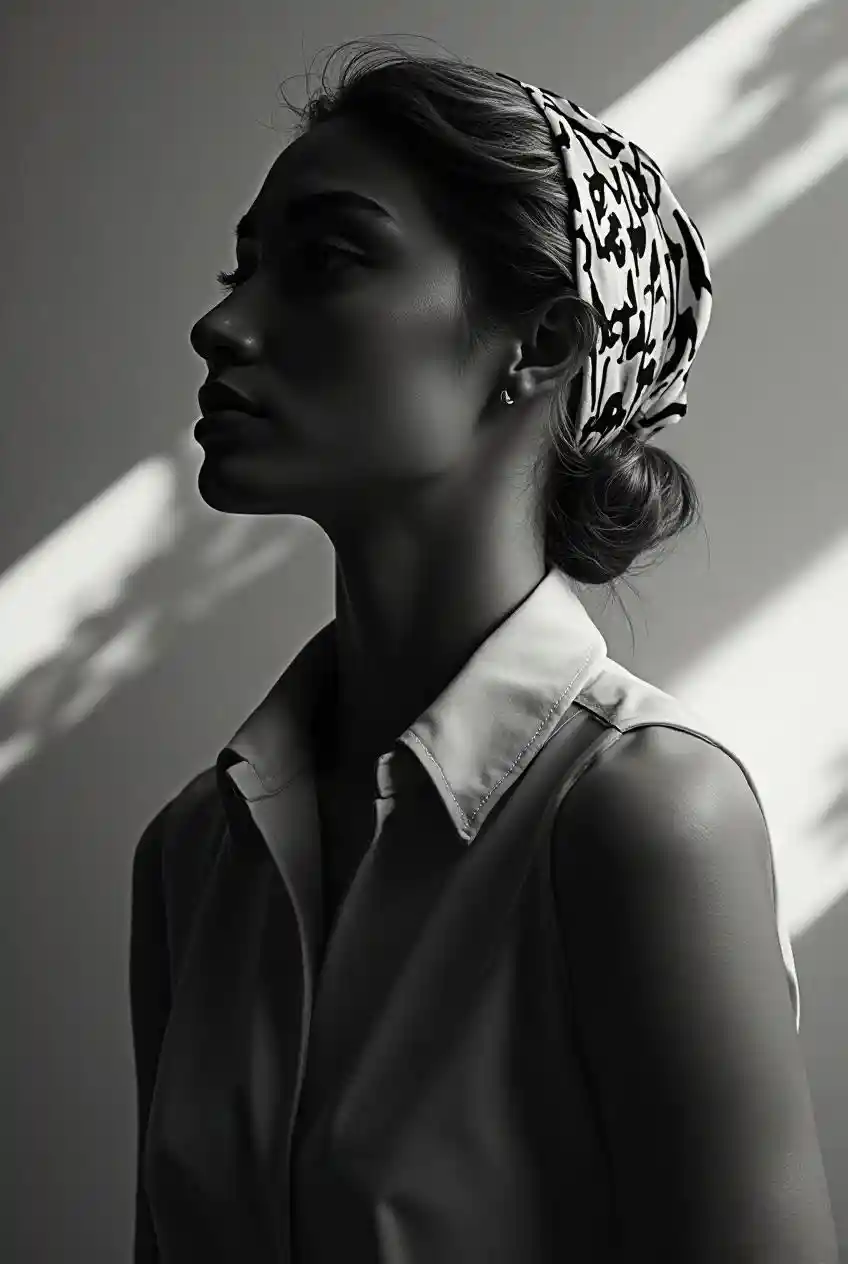 Minimalist black-and-white photography of a model wearing a head scarf, inspired in the style of Yves Saint Laurent with high-contrast shadows.