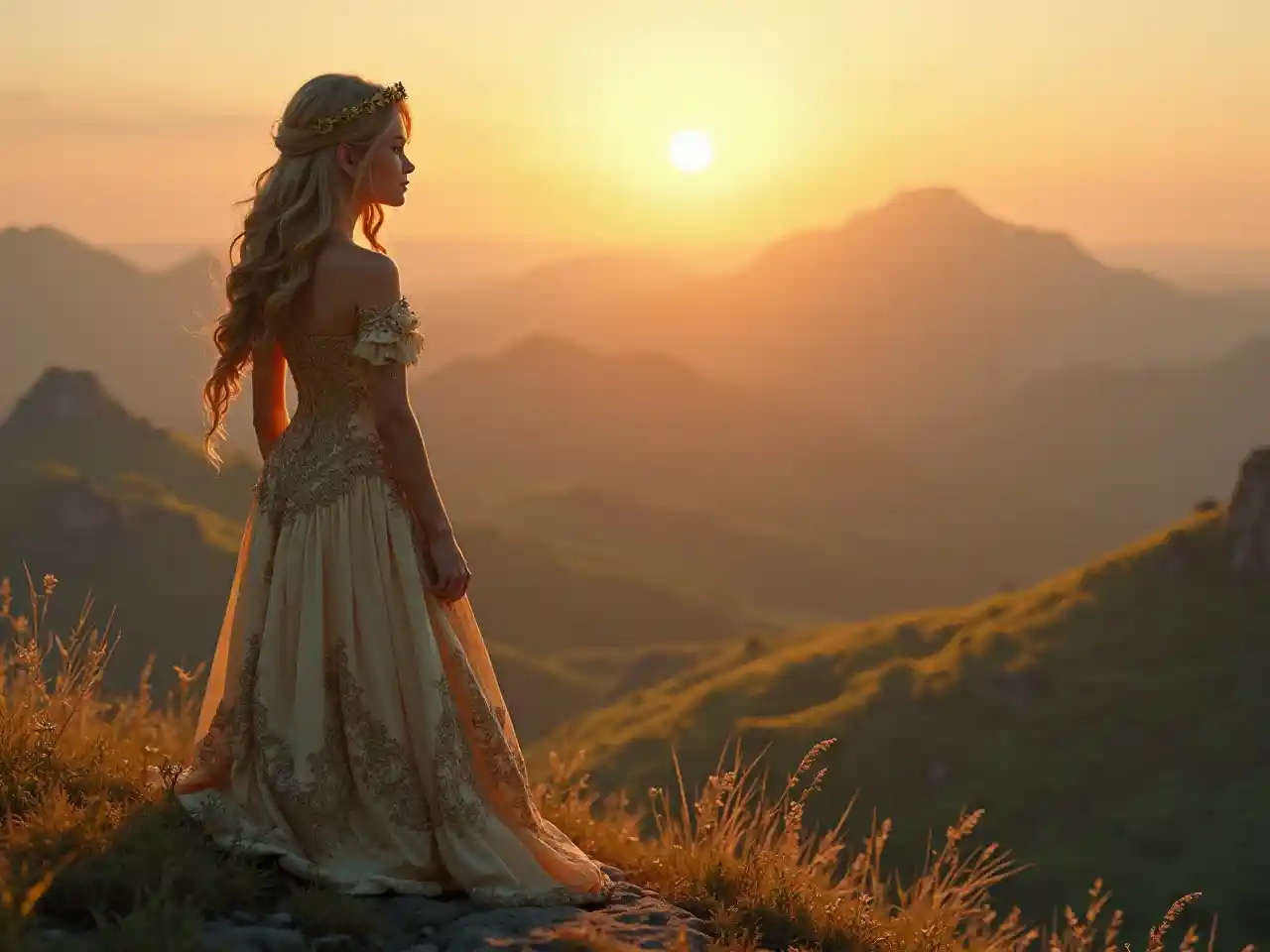Princess Zelda gazes out over a sprawling landscape from a high vantage point, her detailed dress catching the soft, diffuse light of the setting sun. The scene captures the essence of a masterpiece with high quality, showcasing intricate patterns and volumetric lighting that adds depth to the image. The outdoors setting fills the frame, yet features slight imperfections—such as minor anatomical exaggerations and the suggestion of blurred motion in her fingers—adding a touch of surreal charm. Subtle textures hint at the presence of jpeg artifacts, while the absence of any visible signatures or markings keeps the focus on Zelda and the enchanting view around her.