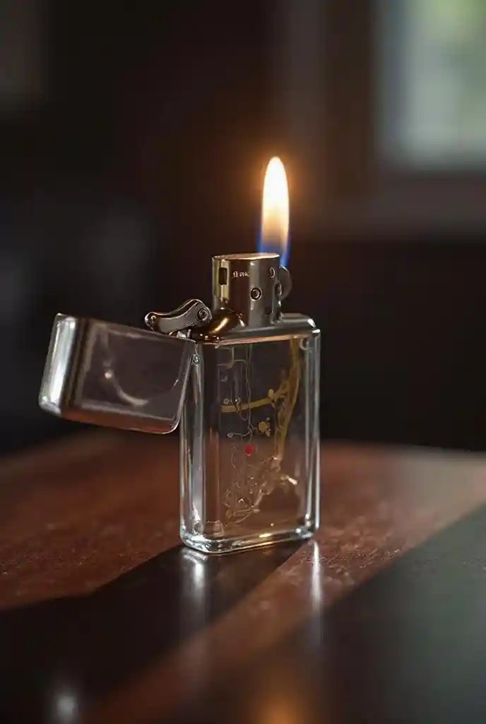 ANNA(high detail).Gasoline lighter "Zippo" on a lacquered table, transparent body, the cap is open, the wick burns emitting streams of light.