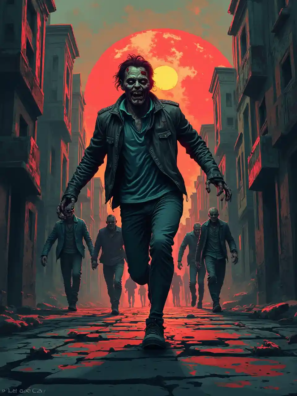 tshirt print design of ZOMBIE HORDE RUNNING THROUGH CITY, cyberpunk