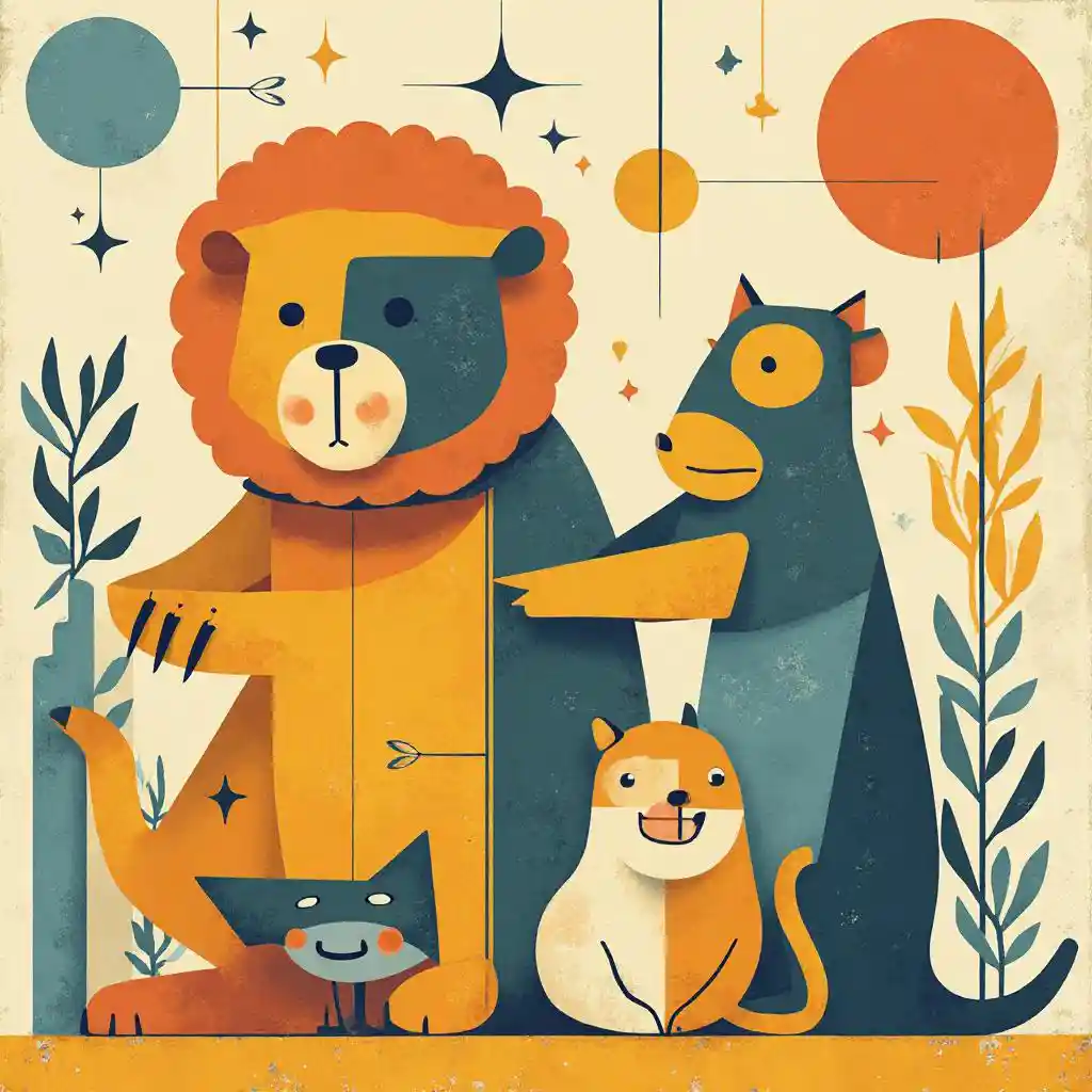 zoo, (animals, lion, cat, dog, pig, monkey),bauhaus style, geometric parts, mutile lines, multi circles, 3triangles,(color palette is light blue orange yellow g