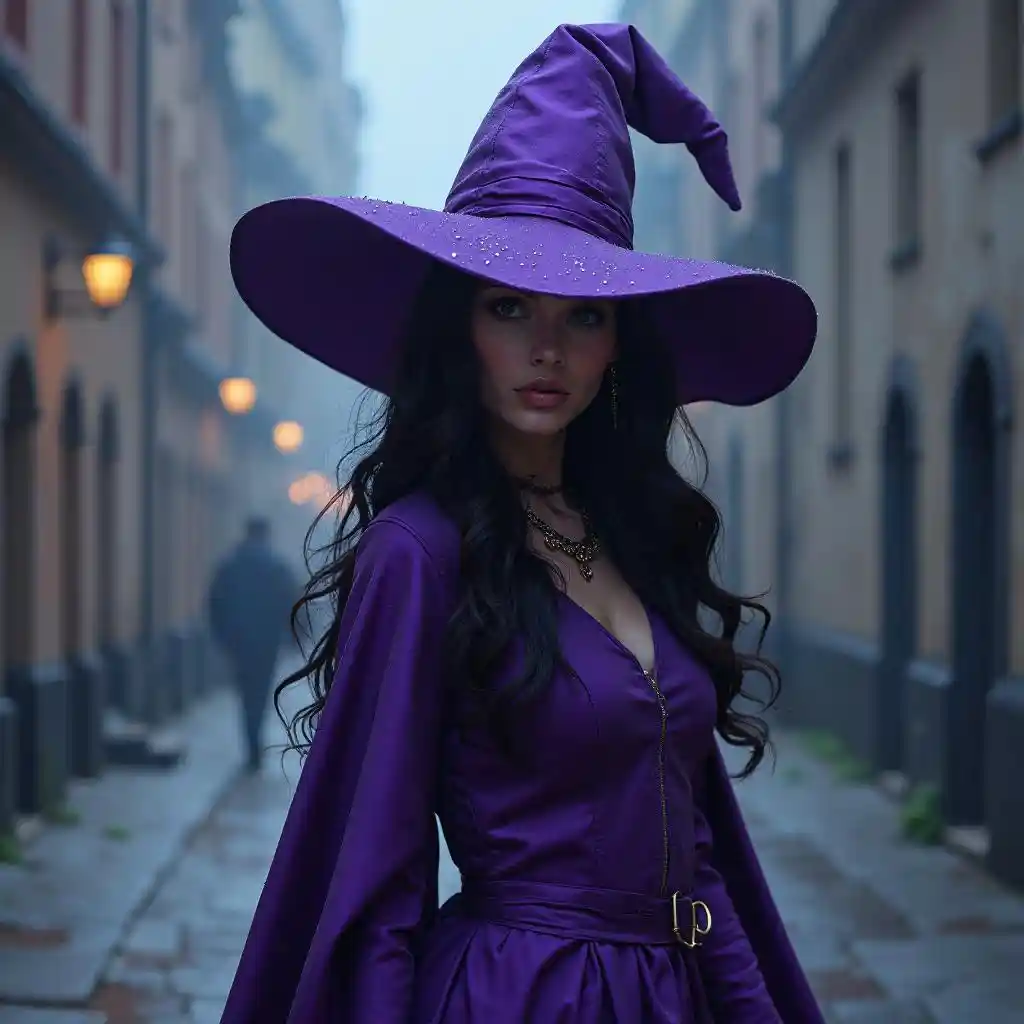 Witchy zoora of the Velvet Glove” in an ordinary world, but fallen into mystery. Zora, the mysterious figure who wanders the city among the people, always senses the unusual in her movements, something that the world hides behind the veil of everyday reality ,zoora she’s wearing long purple adress with long purple gloves and purple witch hat