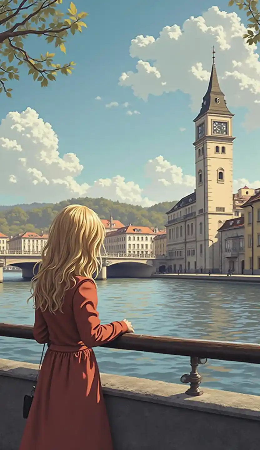 What I'm imagining is、What I'm imagining is、Zurich cityscape、Impression of a government building in the center of the city、Riverside、Blonde 20-year-old woman in