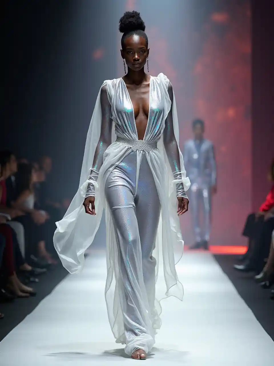 Donna africana, passerella, passerella per le sfilate. Vista del modello completo. Una fashionista futurista si sfiora lungo la passerella con un abito di seta bianca trasparente, portando un'atmosfera audace e alla passerella.
