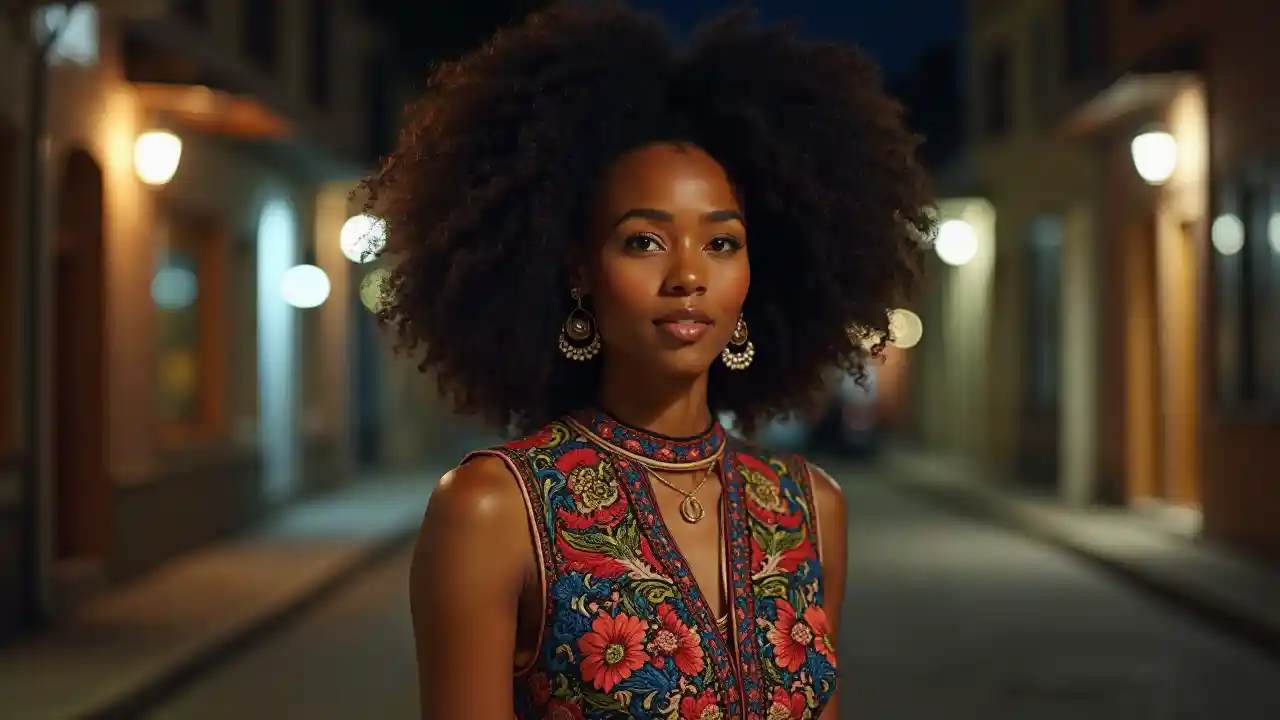 PeytonBella donna nera e sexy con i capelli afro, indossa un abito ricamato colorato e vibrante, a mezza, di notte