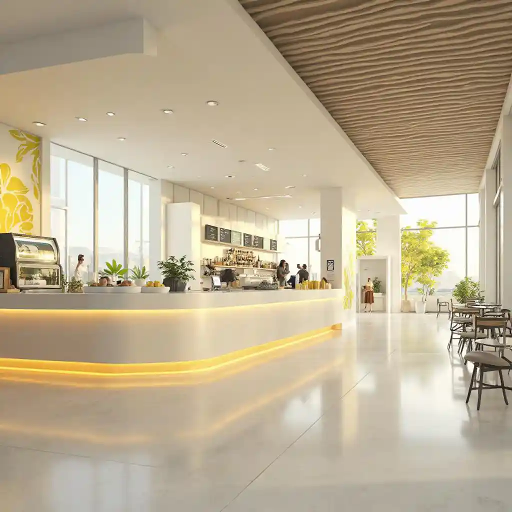 Progettazione di un bar in aeroporto con il colore principale bianco e il colore più chiaro giallo