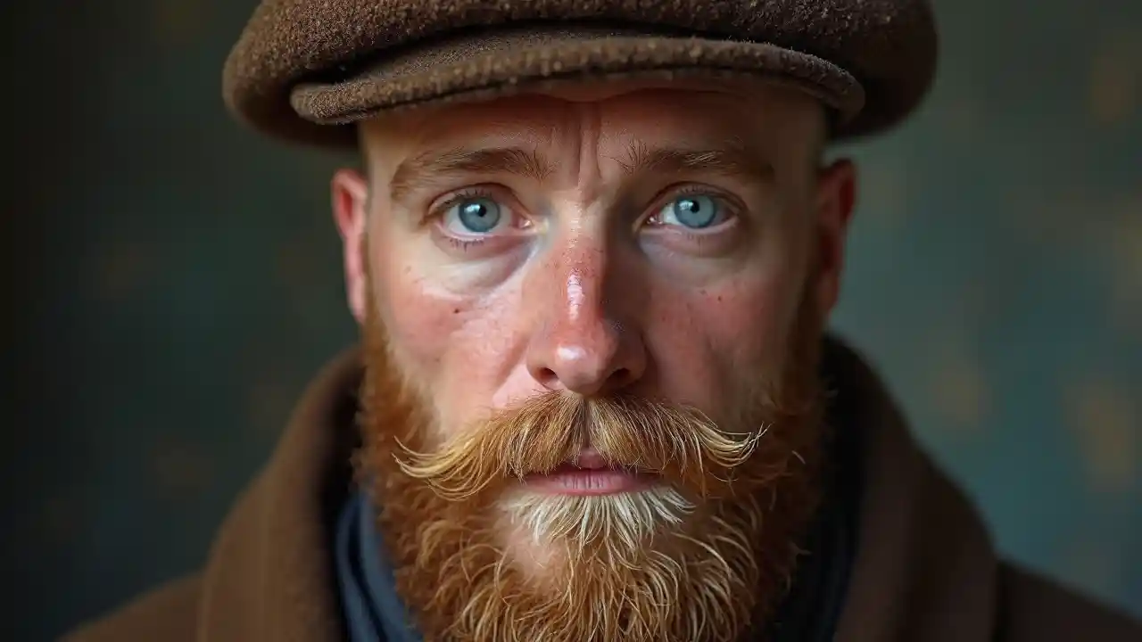 Uomo albinos, occhi azzurri con una barba marrone, indossa un berretto dello stesso colore, forma mascella quadrata