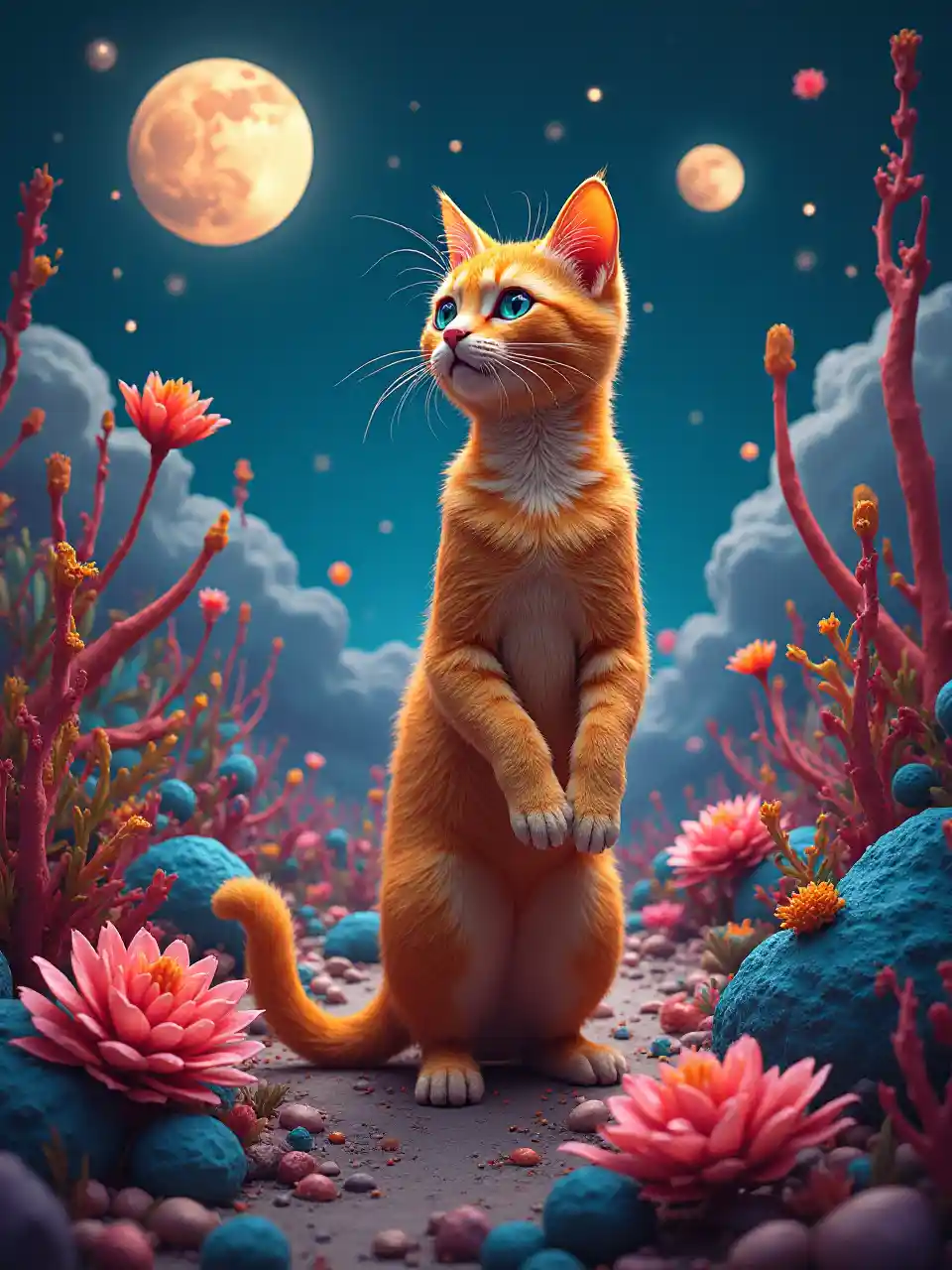 Un gatto arancione fluorescente, in piedi sulle zampe posteriori in un paesaggio alieno surreale con piante uniche, lune multiple, creature capricciose, e modelli luminescenti che si intrecciano tra i fogli di fantasia. La scena emana un affascinante senso di meraviglia e magia. "Iperrealista, splash art, concept art, scatto centrale, dettagliatamente, profondità del colore, drammatico, angolo 2/3 del volto, luce laterale, sfondo colorato"